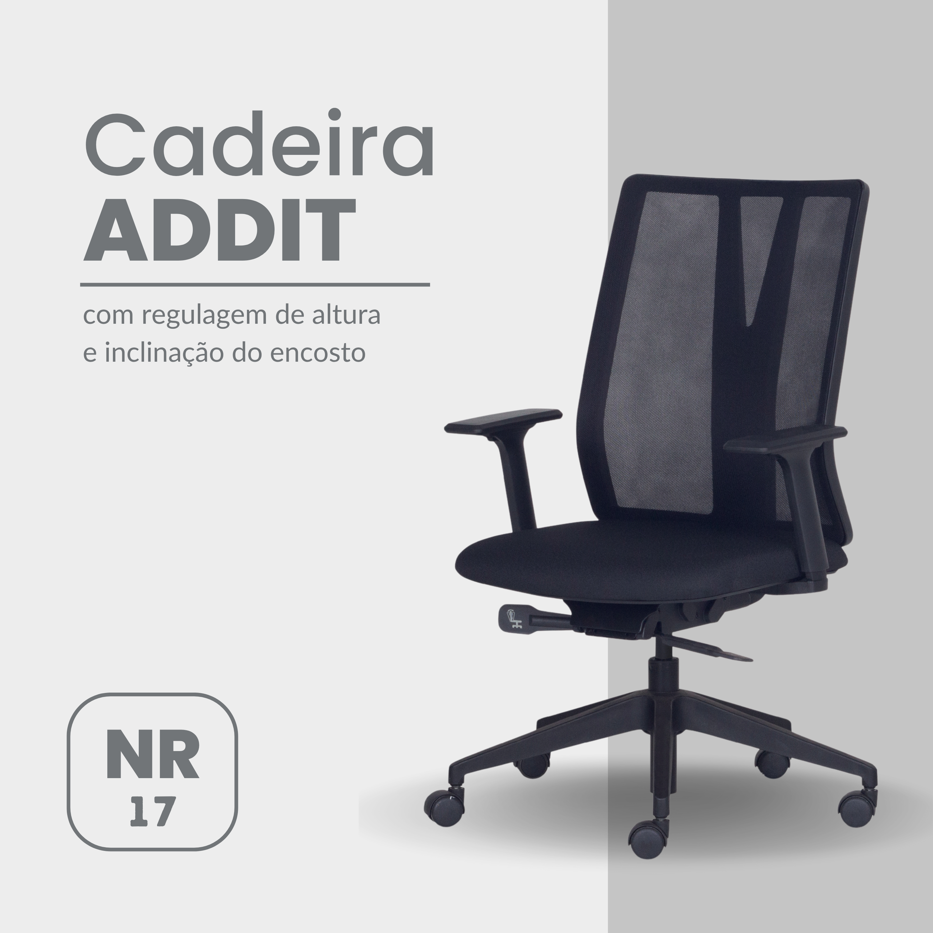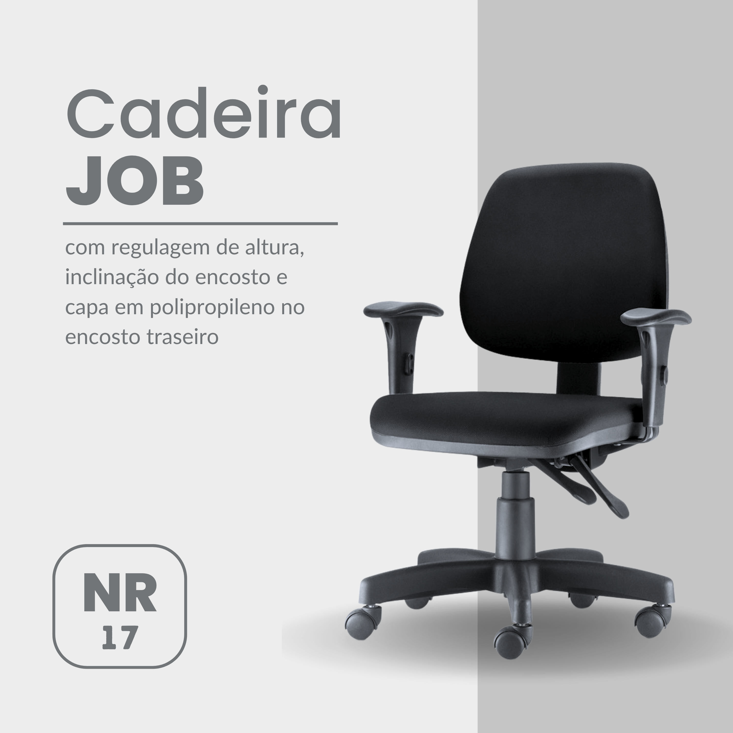 Altura do Assento ajustável, encosto com curvatura que apoie a lombar e com regulagem de inclinação, bordas do assento arredondadas, revestimento de material que permita troca de calor com o ambiente, base estável com cinco apoios (tipo estrela), rodízios para deslocamento e base giratória, apoio para braços (quando exigido pela atividade).